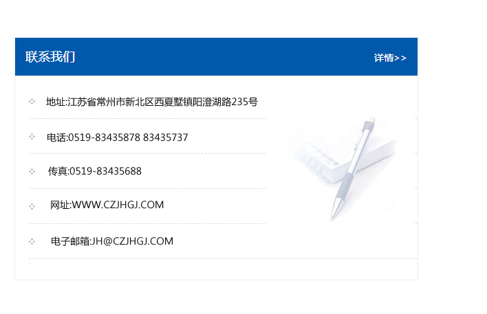 地址:常州市新北區友邦商務大廈1幢16、17層  電話:0519-85101652  傳真:0519-85112595  郵編:213022  網址:www_cz-jiayue_cn.touchinsight.com  郵箱:xiajifengaa@163.com